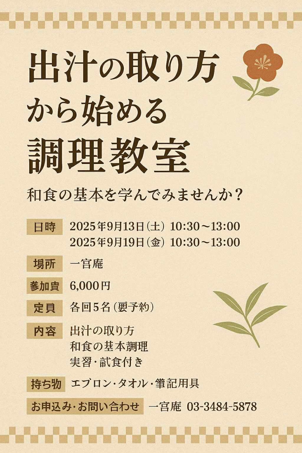 基本の出汁の取り方、米の研ぎ方に始まり和食の調理の基本をお教えします。