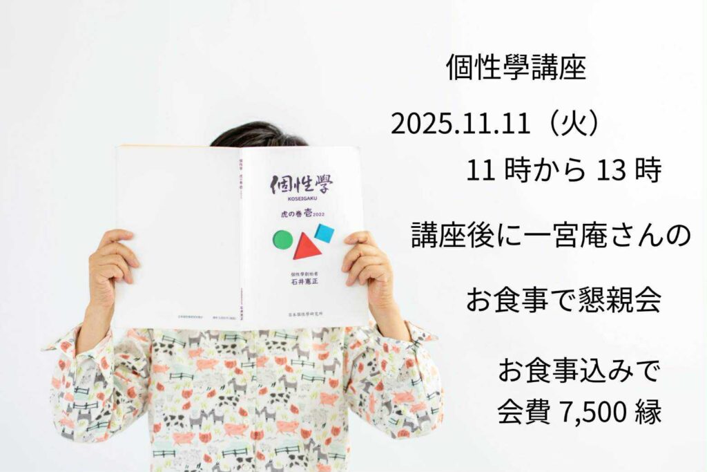 21.個性學教室 11/11(火) 2025年10月24日 最終更新日時 : 2025年10月24日 fumie 日程:11月11日(火) 時間:11時から13時会費:7500円です。 ご予約の際には生年月日のご記入をお願いいたします。 個性學は、一人ひとりが生得的(生まれ持った)に備わっている内面的『特性や能力』を客観的に理解し、それを磨き、社会の発展に貢献することで自らも幸せになるために確立された実践学です。 •自分らしくイキイキと生きたい方•自己マネジメント能力を高めたい方•コミュニケーション能力を高めたい方にオススメです。